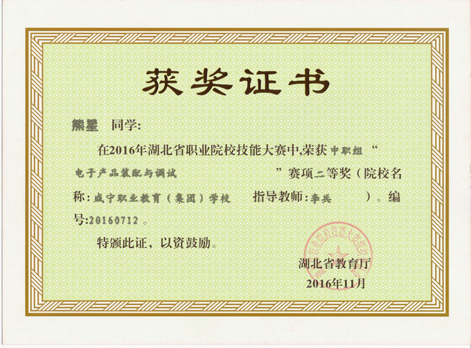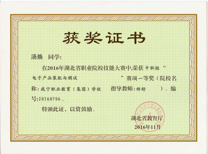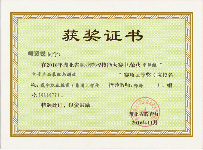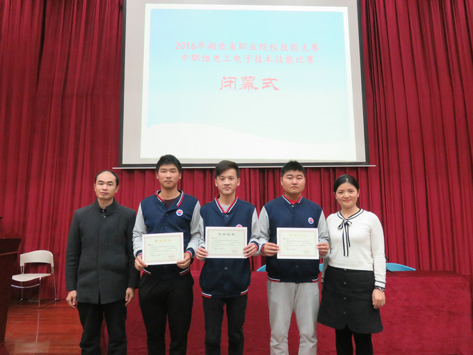 2016年11月11日——13日,湖北省职业院校技能大赛中职组电工电子技术技能比赛在武汉仪表电子学校隆重举行,全省共有16只代表队45名选手参加比赛,我系1401班电子电器应用与维修专业学生熊星,1501班电子与信息技术学生汤焕和梅贤锐代表咸宁市参加了电子产品装配与调试赛项的比赛。四个小时紧张的比赛之后,我校学生不负众望,比赛成绩取得了历史性突破,汤焕同学荣获一等奖,熊星同学荣获二等奖,梅贤锐同学荣获三等奖!