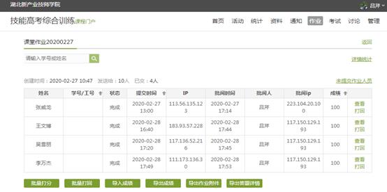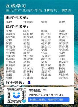 教师授课时,必须保存每次授课资料,做好上课截屏资料收集和整理,主要包含学习任务、教师辅导、作业布置、学生作业的收集、批改等,一周上交一次,教务科进行统计,资料将会作为教学检查、教师课时量核算、教师教学考核的主要依据,目前教师的完成率达100%。要求授课教师统计学生上课人数,保证上课出勤率,做好作业登记批改,并将出勤和作业情况发布在家长群中,由家长进行监督,目前效果显著,我系18级学生在线上课率和作业完成率达73%,19级学生上课率和作业提交率达到90%,另外,针对最近网上教学时出现的有违师德师风的案例,严格要求教师在上课时真正做到为人师表,率先垂范,坚决杜绝违反师德师风的事件发生。