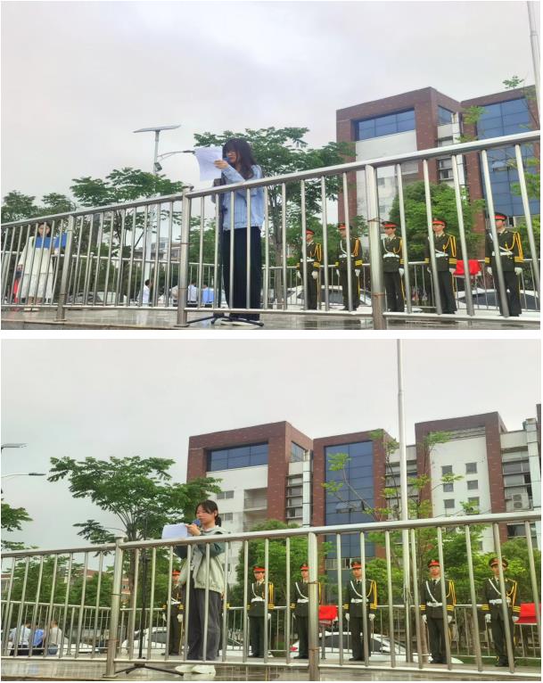 晨曦划过天际,五星红旗迎着瑰丽的朝阳冉冉升起,国旗护卫队身着仪仗礼服,挺拔威武,迎着耀眼的金光,喊着缭亮的军令,庄严升旗。全体师生肃立,行注目礼,齐唱国歌。