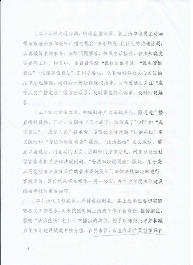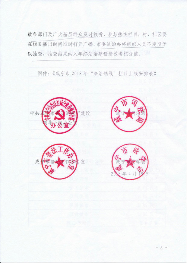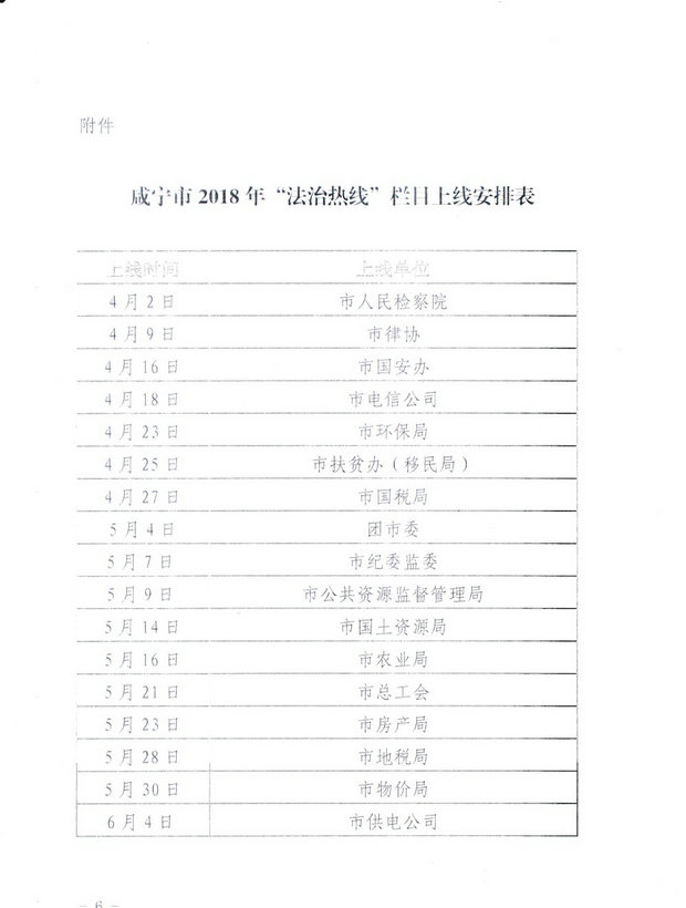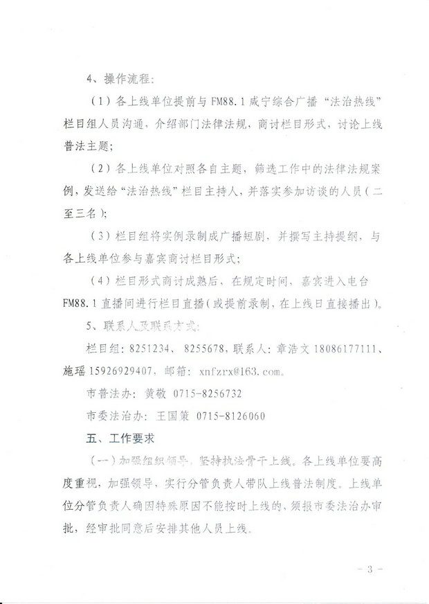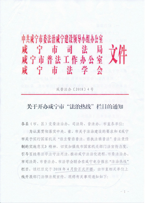 为认真贯彻落实中央、省、市关于法治建设的要求和《咸宁市关于实行国家机关“谁主管谁普法、谁执法谁普法”普法责任制的实施意见》精神,切实加强法治宣传力度,引导百姓尊法、学法、守法、用法,推动咸宁法治化建设进程,市委法治办、市司法局、市普法办、市法学会联合在咸宁电台推出“法治热线”栏目,并于2018年4月份正式开播,现将有关事项通知如下: