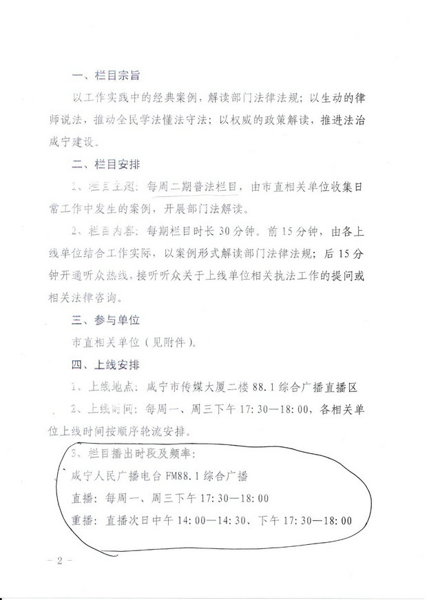 要求:各位干部要收听、参与栏目热线,并留存资料,市委法治办将不定期予以抽查,抽查结果纳入年终法治建设绩效考核分值。