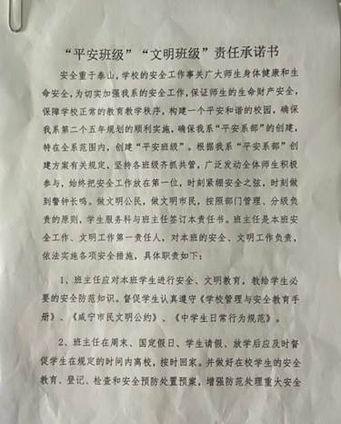 签署“平安班级”“文明班级”责任承诺书将平安、文明责任明晰化、层层分解到个人、落实到每一个师生,为建设和谐美好的校园营造了良好的氛围、筑牢了行动的根基。