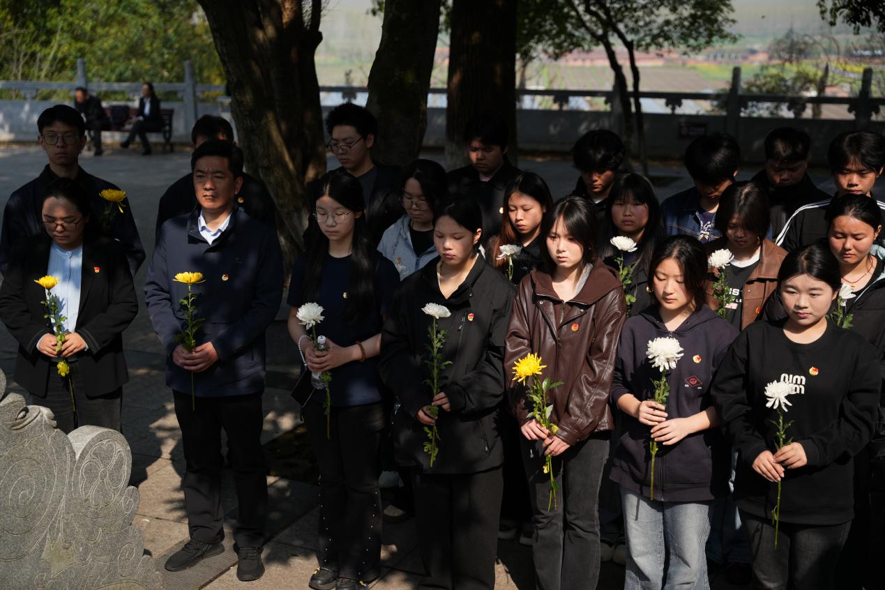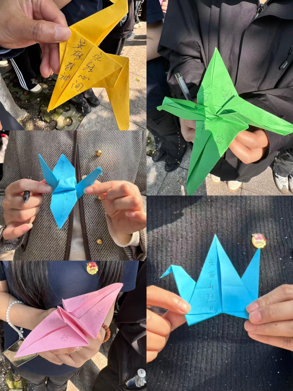 在庄严肃穆的文庙山烈士陵园,全体师生整齐列队,向革命烈士敬献鲜花,默哀致敬,寄托对英烈的崇高敬意与深切缅怀。随后,一场特别的 “千纸鹤心灵疗愈” 活动温情开展。在心理健康中心专业老师的引导下,同学们静下心来,通过深呼吸平复心绪,将对先烈的敬意、对先辈的感恩与对生活的期许,一点点折进彩纸中。蓝的思念、黄的期许、粉的牵挂,都化作指尖的折痕,同学们在千纸鹤的翅膀上写下“铭记历史,吾辈自强”“珍惜当下,向阳生长”等话语,将承载着初心与敬意的千纸鹤轻轻挂在祈福处,让每一只纸鹤都成为传承精神的载体,在春风中传递着青春的誓言。