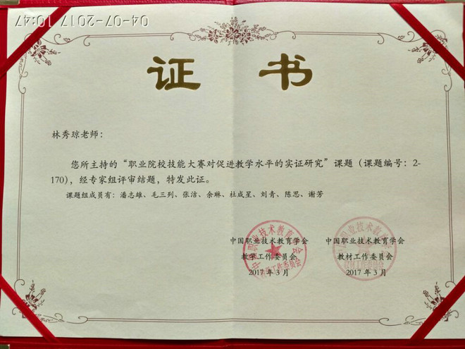 3月20日由我校林秀琼老师主持的“职业院校技能大赛对促进教学水平的实证研究”课题(课题编号:2-170),经专家组评审顺利结题,这标志着我校教师科研水平迈上一个新台阶。