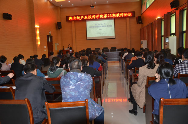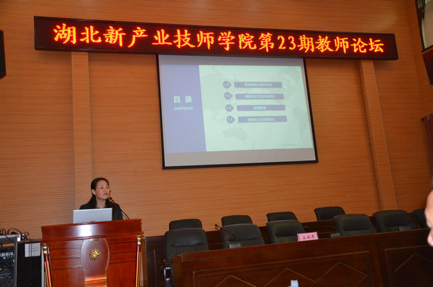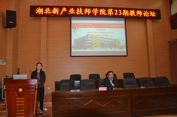 2018年4月25日下午,我校第23期“教师论坛”在行政楼二楼大会议室举行,此次论坛由副校长李毓红同志主讲,她主讲的题目是《校企合作---学院可持续发展的必由之路》,论坛由校长易元红同志主持,参加学习的人员有校领导、各处室、系部负责人、教务科长及教师。