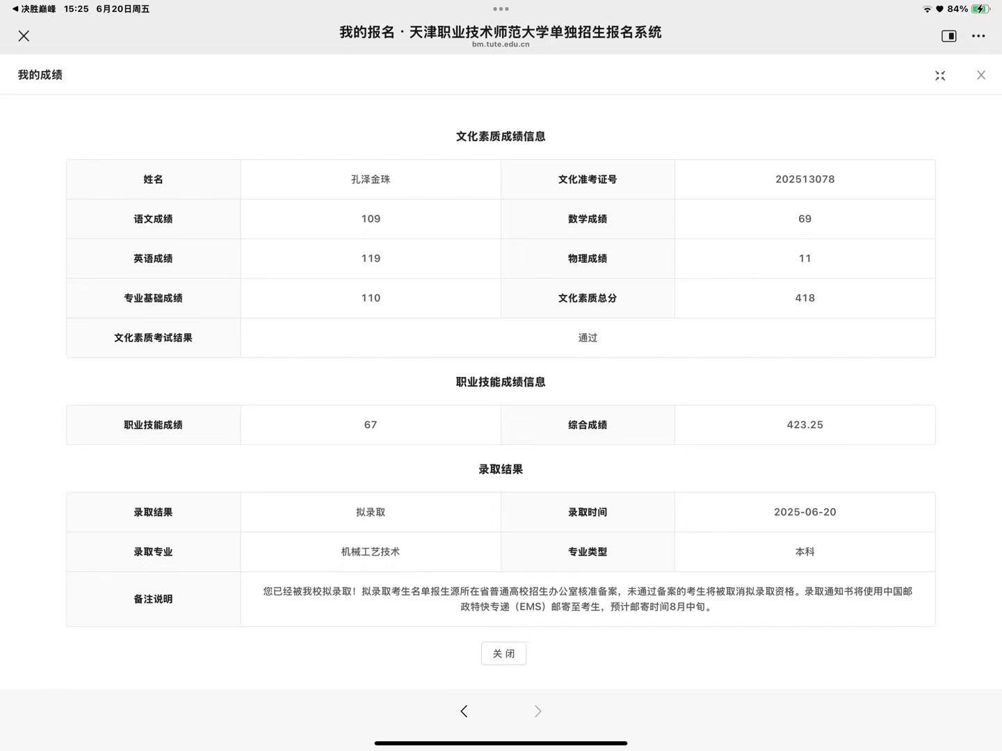 喜讯,是对选择与坚持的最佳回馈。 2025年6月20日,孔泽金珠如愿收到了天津职业技术师范大学机械工艺技术专业的拟录取通知! 她成功通过单招考试,实现了从中职生到公办本科大学生的华丽转身。