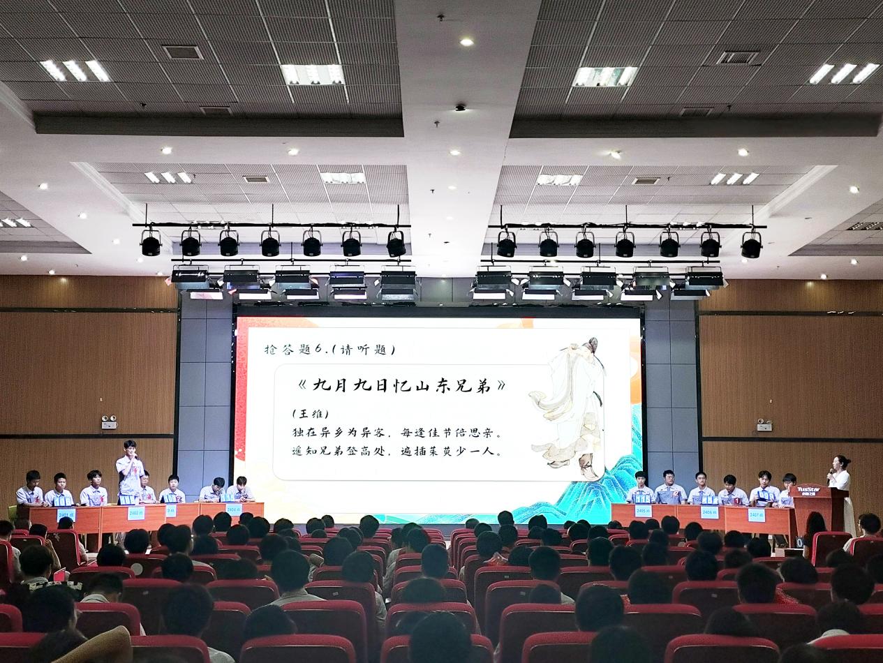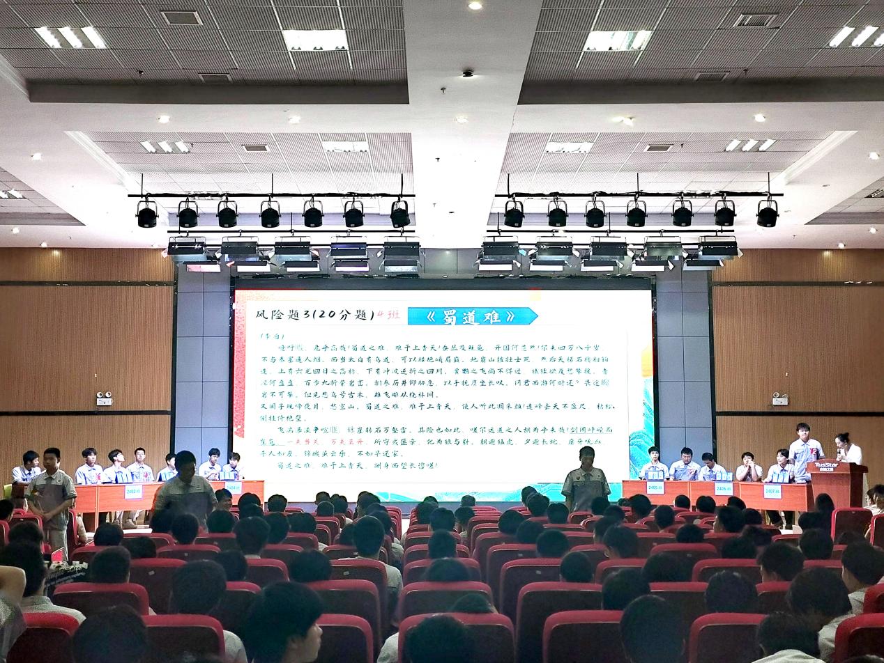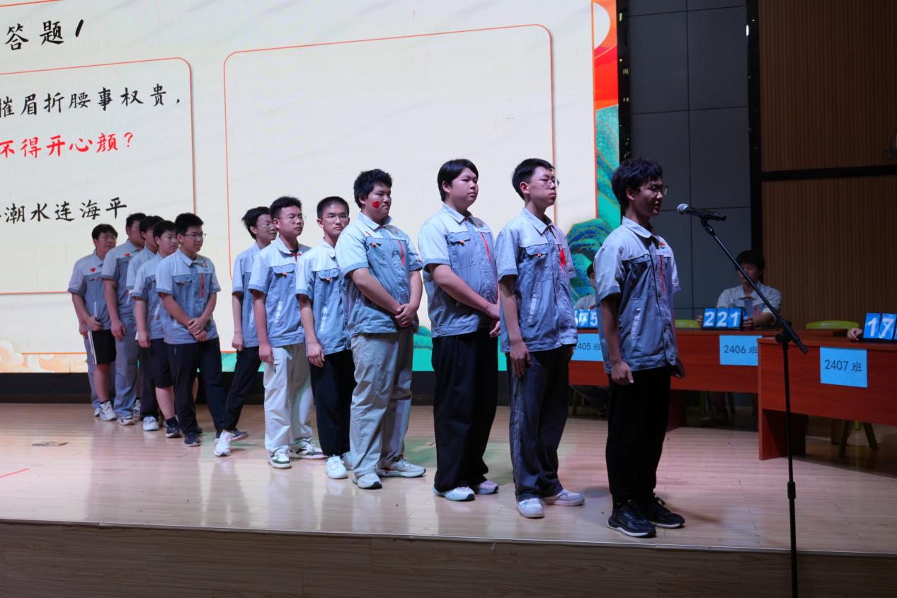 大幕未启,战意已燃,一场融合记忆、气势与美学的诗词“拉歌”对决,在《诗经·秦风》的战吼中轰然炸响。“2401班《无衣》接战!”指令如烽火传檄,“岂曰无衣?与子同袍!” 先秦战歌化作声浪矩阵,将参与度化作沸腾的星河。紧接着2402班《月下独酌》惊艳四座。一轮接一轮,持续20分钟后,当赛诗的分数定格在大屏幕时,为即将到来的大赛写下气吞山河的序章——原来所谓文化传承,不在故纸堆中,而在少年们灼热的眼瞳与震天的呐喊里。