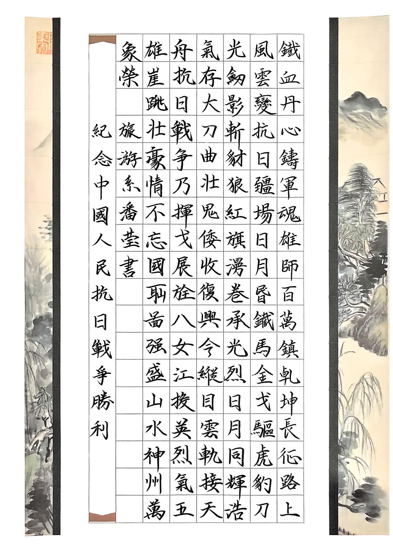 书法作品中,楷书的端庄大气、行书的流畅洒脱等多样书体交相辉映,既展现了教师扎实的艺术修养,更让红色精神通过笔墨得以具象化传递,不仅能感受书法艺术之美,更能透过文字重温抗战岁月,在潜移默化中接受精神洗礼。