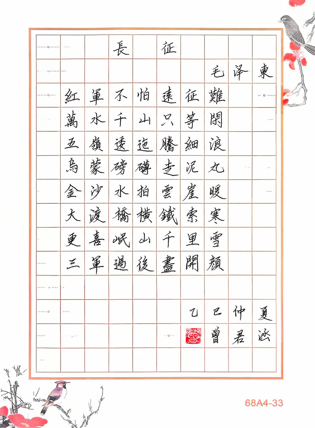很不错,笔画有粗细变化,结构得当,可以看得出你临过古代的碑帖,是从王羲之一路书风走下来的,更像元朝赵孟頫一路的书风。笔画和结构都非常得当,但最后印章大了,全篇章法要注意字之间的大小关系,疏密关系。