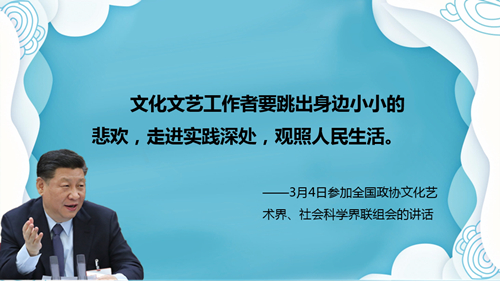 【原文】人民是创作的源头活水,文化文艺工作者要跳出身边小小的悲欢,走进实践深处,观照人民生活,表达人民心声,用心用情用功抒写人民、描绘人民、歌唱人民。哲学社会科学工作者要走出象牙塔,了解百姓生活状况,解疑释惑,把学问写进群众心坎里。