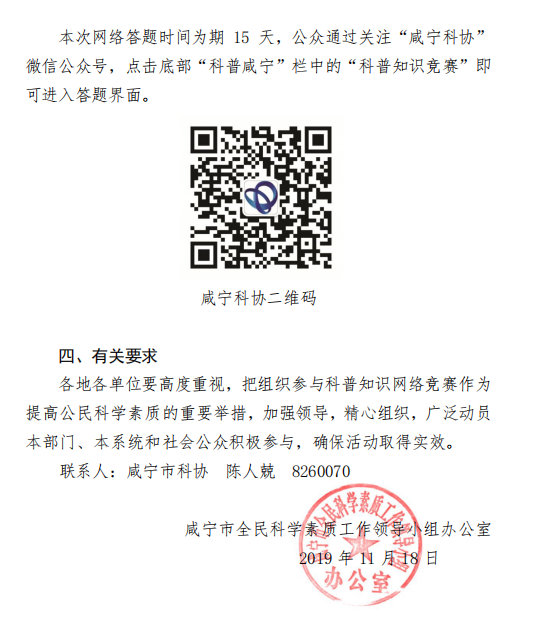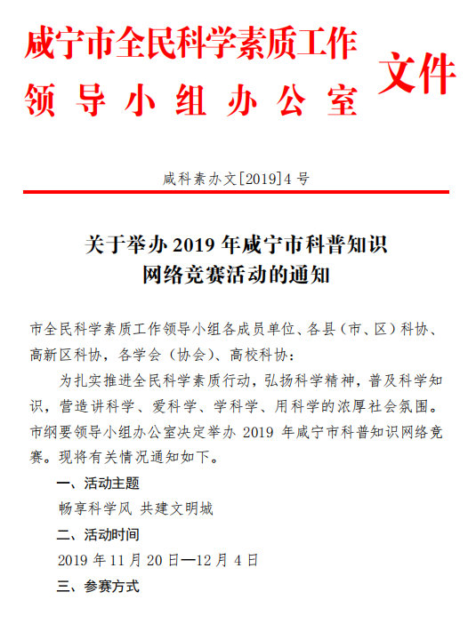 关于举办2019年咸宁市科普知识网络竞赛活动的通知
