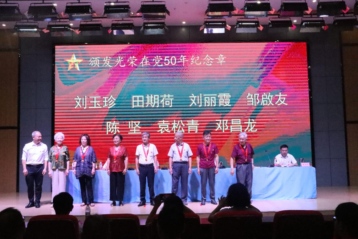 校党委书记明继武为老党员颁发“光荣在党50年”纪念章;校党委为3个“先进基层党组织”、21名“优秀共产党员”、15名“优秀党务工作者”颁发奖牌和荣誉证书。