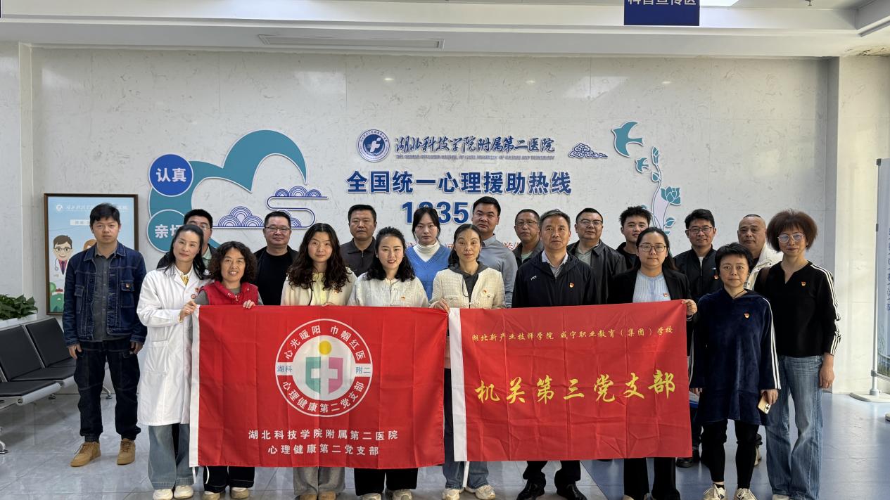 为深化校院合作、强化党建引领,推动党建工作与业务工作深度融合,4月17日上午,咸宁职业教育(集团)学校机关第三党支部与湖北科技学院附属第二医院心理健康第二党支部,在湖北科技学院附属第二医院3号楼9楼一号会议室,联合开展共学共建活动暨2026年第四期支部主题党日活动。湖北科技学院附属第二医院副院长曹文韬、咸宁职业教育(集团)学校党委委员、副校长杜成星参加活动,校院双方党支部全体党员共同参加。
