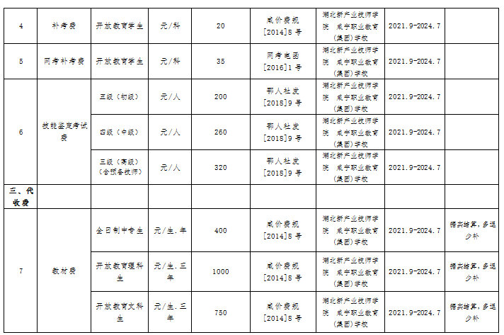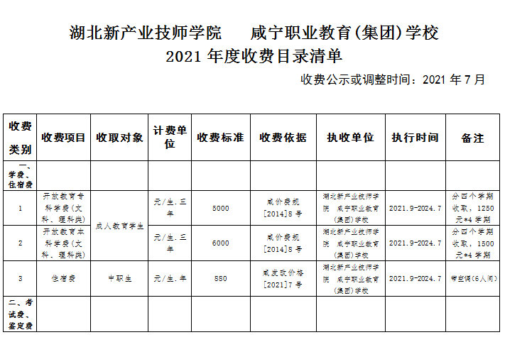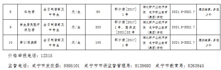 湖北新产业技师学院 咸宁职业教育(集团)学校2021年度收费目录清单