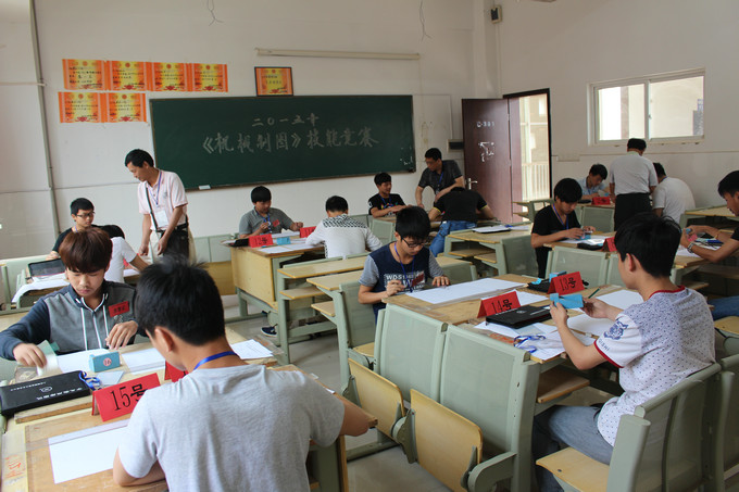 比赛分为初赛和决赛两个阶段,初赛选拔出18名成绩优异的学生进入决赛。决赛注重实操技能的考核,每一名参赛选手都要完成通过抽签确定的模型实体的测绘,并按要求绘制出实体的三视图和轴测图,并标注尺寸。在3个小时的紧张比赛中,决出了一等奖1个,二等奖2个,三等奖3个,优秀奖6个,优秀团体奖1个。