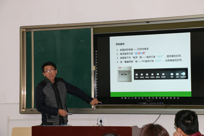 为保证本学期各项工作任务顺利完成,3月22日下午,电子信息系召集全体教职员工在教学楼D206教室召开工作推进会,并安排专人对全系教职工进行一体机使用方法的培训。