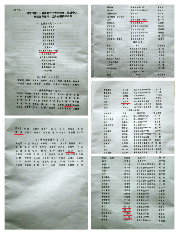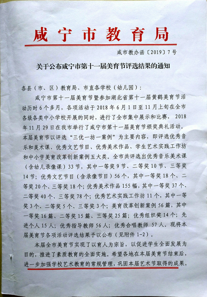 2019年3月5号市教育局[2019]7号文件公布了咸宁市十一届黄鹤美育节评选结果。