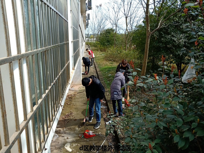 活动中,同学们互相合作,个个干劲十足,不怕脏、不怕累,很快各小组成员将校园3、4栋男宿舍和5女宿舍楼下的清洁区打扫干净,将d区教学楼外侧绿化带清理清理干净,将阶梯教室的平台和楼道拖得一层不染。