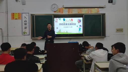 10月23日晚自习,一场以手机危害为主题的班会在电子信息系19级电子信息3班召开,校党委委员、副校长刘昌明同志亲临活动现场,参与班会讨论,就手机对生活的改变,以自己为例给大家进行了深入的剖析,同时就青少年应该如何正确使用手机提出自己的意见建议。他指出,手机改变了我们的生活,我们要正确利用好手机,娱乐要适度,莫让手机耽误了学习、影响了正常生活。同学们也积极上台表达自己观点,台下同学也充分利用手机参与话题讨论。通过40分钟的深入讨论,同学们认识了手机所带来的危害,表示今后生活中尽量减少手机对自己生活的影响,争做有理想,有追求的学生。整个班会氛围十分融洽。最后,刘校长建议像类似主题班会可以多开、常开,开出特色,开出新意。