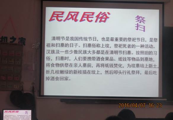 经济管理系于2016年4月7日下午,组织全系学生召开“又是一年清明节,追忆先烈”的思想教育主题讲座。通过这次主题班会,希望学生能全面正确的了解清明节,深切感受其文化内涵,积极的过一个有意义的清明。同时,引导学生了解中华民俗、风情和传统美德,继承先烈遗志,发扬革命精神,珍惜现在的美好生活。