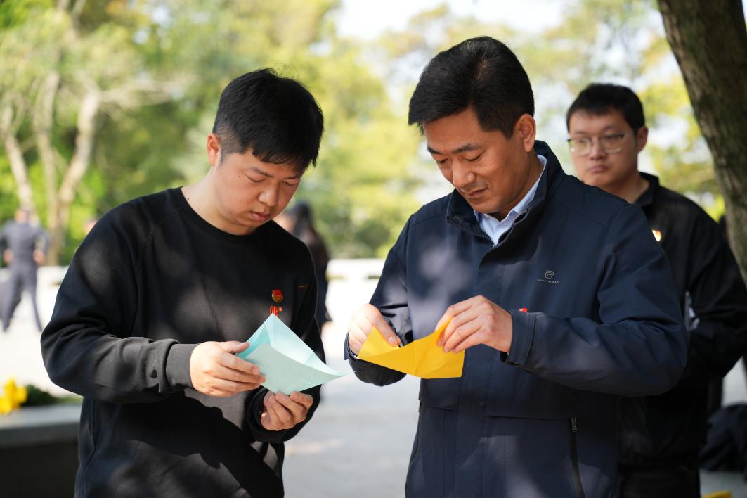 在庄严肃穆的文庙山烈士陵园,全体师生整齐列队,向革命烈士敬献鲜花,默哀致敬,寄托对英烈的崇高敬意与深切缅怀。随后,一场特别的 “千纸鹤心灵疗愈” 活动温情开展。在心理健康中心专业老师的引导下,同学们静下心来,通过深呼吸平复心绪,将对先烈的敬意、对先辈的感恩与对生活的期许,一点点折进彩纸中。蓝的思念、黄的期许、粉的牵挂,都化作指尖的折痕,同学们在千纸鹤的翅膀上写下“铭记历史,吾辈自强”“珍惜当下,向阳生长”等话语,将承载着初心与敬意的千纸鹤轻轻挂在祈福处,让每一只纸鹤都成为传承精神的载体,在春风中传递着青春的誓言。