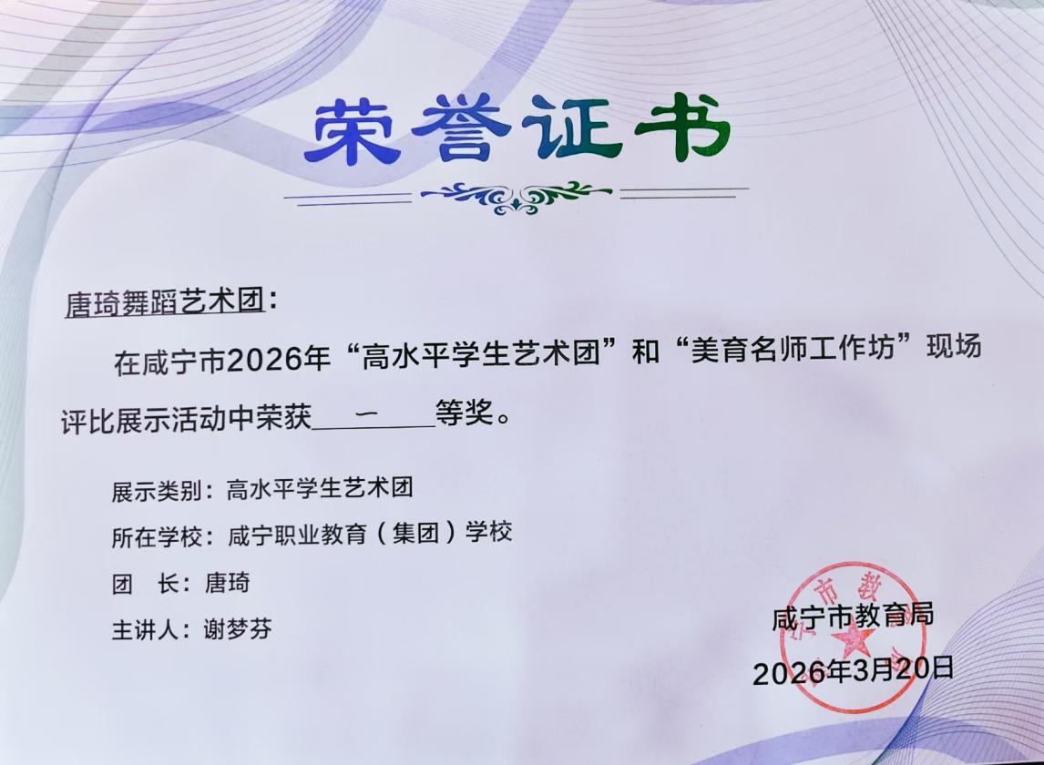 近日,咸宁市高水平学生艺术团展评活动在温泉中学圆满落幕。此次活动既是落实市委市政府提升基础教育质量三年行动部署的具体实践,也是全市学校美育成果的集中展示与检阅。我校“唐琦舞蹈高水平艺术团”凭借过硬实力,从16所学校的参赛艺术团中脱颖而出,斩获第一名的优异成绩。