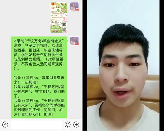 咸宁专场作为我们的主场,这就要求我们要做好宣传工作,积极动员应届毕业生参加线上招聘,同时,院团委要求每个系部上报一个“千校万岗,就业有位来”专题短视频,机械工程系团总支迅速转发该活动的链接和海报,动员各个班级团支部录制一个专题短视频,同学们都积极响应,出谋划策,有的说:“咱们要上交一个最好的”,有的人说“咱们可以把几个人视频的合并在一起”。经过大家的努力,一个“千校万岗,就业有位来”咸宁专场的宣传视频就完成并上传给院团委了!