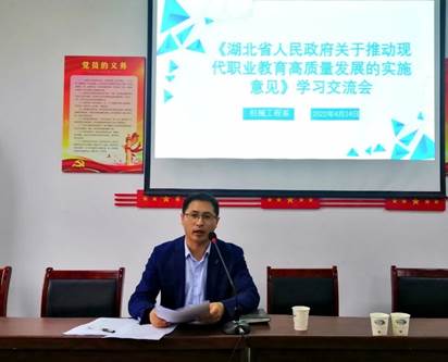 2022年4月15日下午,机械工程系全体教职工开展了集中学习《湖北省人民政府关于推动现代职业教育高质量发展的实施意见》的活动,活动由机械工程系负责人贾相志同志主持并组织学习。
