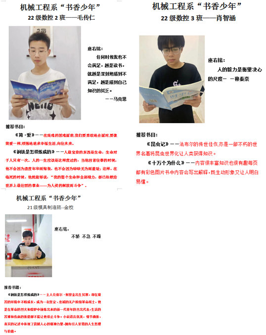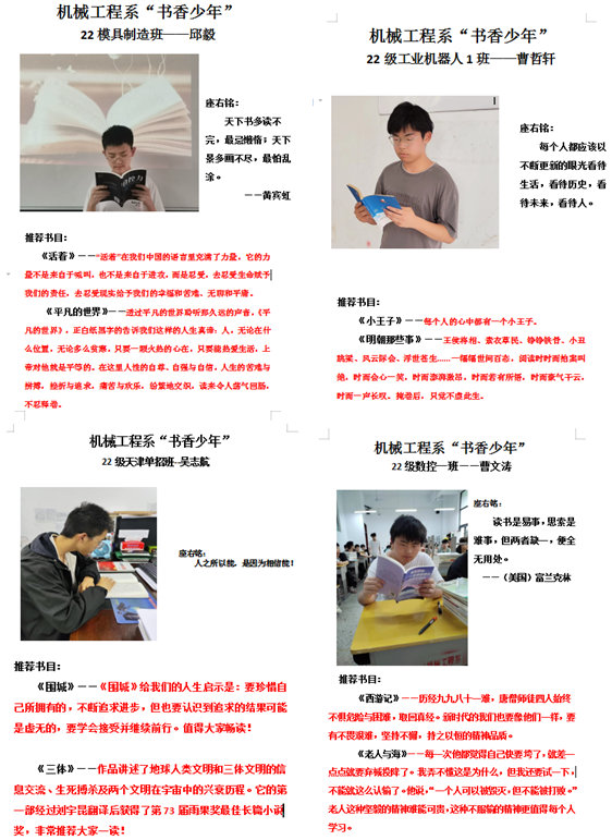 机械工程系在2023年5月根据学校“校园读书月”活动的要求,进行了一系列以“书香少年、书香班级、书香系部”为主题的读书活动,促进我系和我校高质量发展。