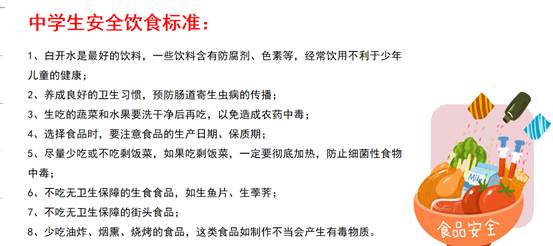 最后,老师们还特别强调,尽管校外的小吃摊与外卖很美味,但其食品安全难以得到保证,同学们绝不能图一时的嘴上欢快而置身体健康于不顾。面对大家都喜欢吃的方便面、香肠、炸鸡、薯条等十几类小食品,应该尽量少吃或不吃。在日常生活中,同学们可以通过以下行为来维护我们的食品安全:饭前饭后以及外出时勤洗手;不喝生水,少喝饮料,减少添加剂的摄入;生吃瓜果要洗干净;不购买三无产品,挑选食品时应注意生产日期与保质期等。不买包装不完整、标识不明的食品;不吃垃圾食品、过期食品。