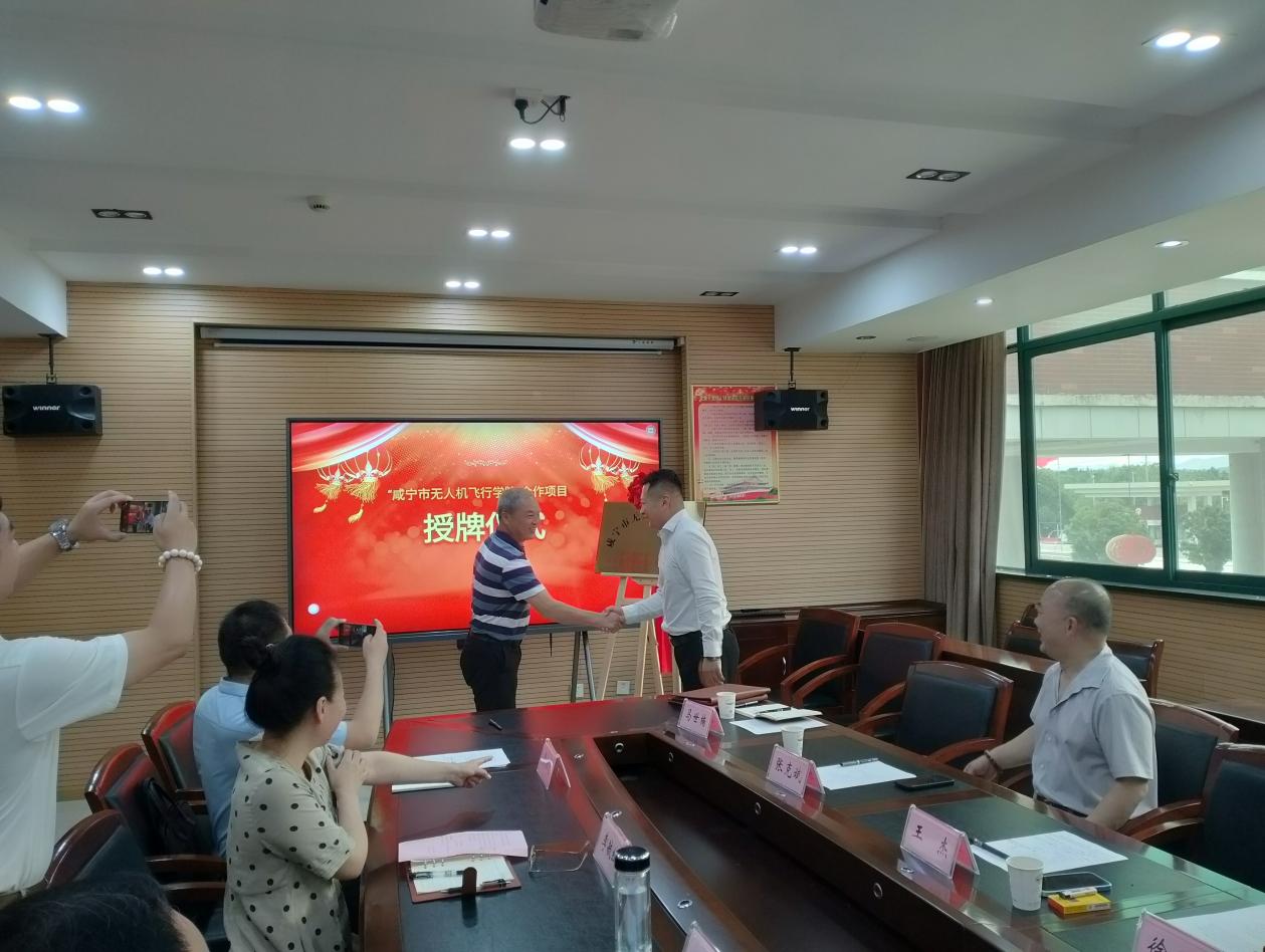 紧接着,校党委书记明继武同志与企业代表共同为“咸宁市无人机飞行学院”揭牌,现场气氛达到高潮。揭牌仪式后,全体与会人员合影留念,记录这一具有历史意义的时刻。