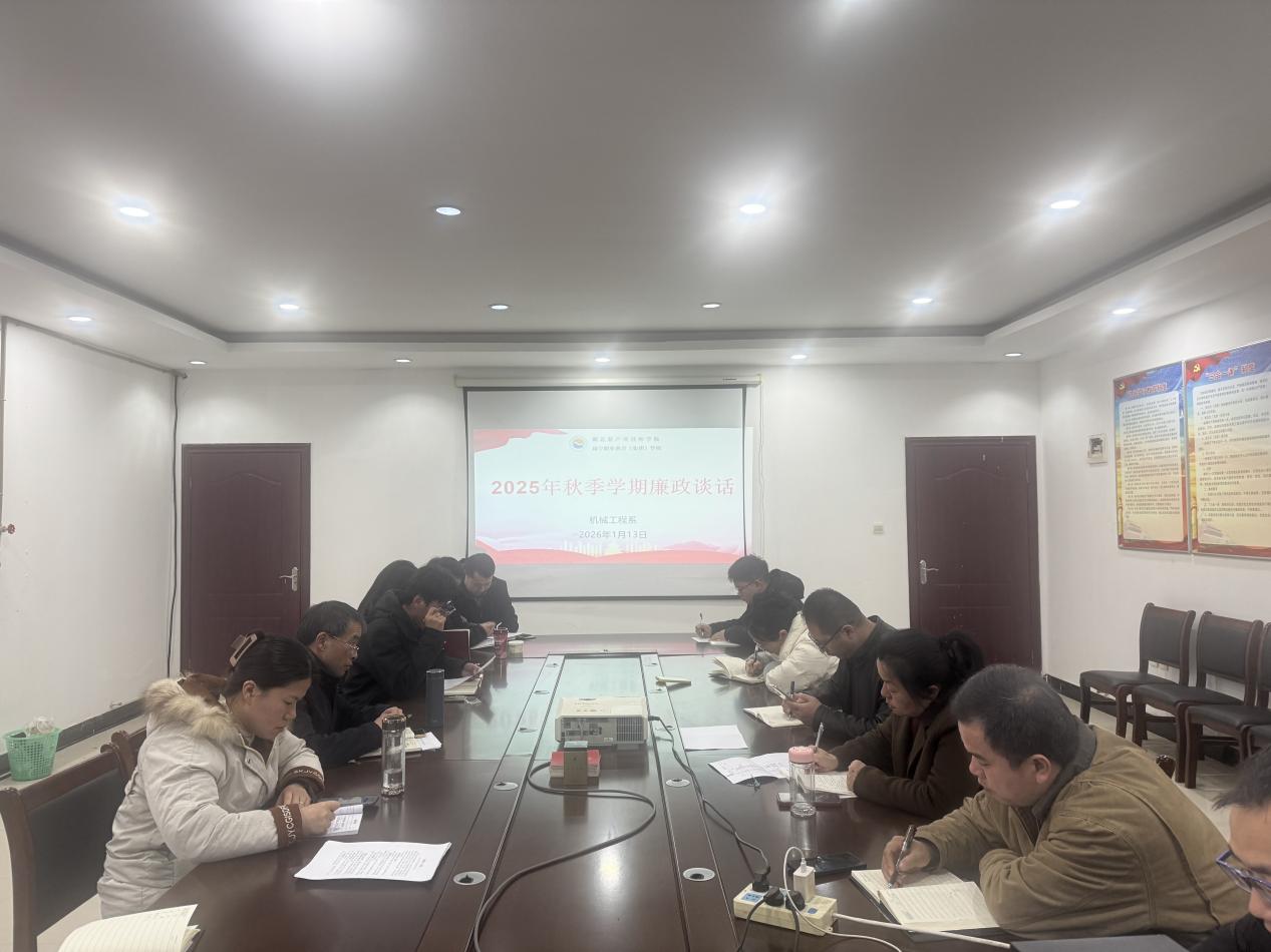 为深入贯彻落实全面从严治党要求,增强党员干部廉洁自律意识,2026年1月13日晚上,机械工程系召开2025年秋季学期廉政谈话。会议由系党支部书记张颖主持,系部负责人贾相志、副主任何辉出席,党支部成员、各部门负责人及班主任代表参加会议。