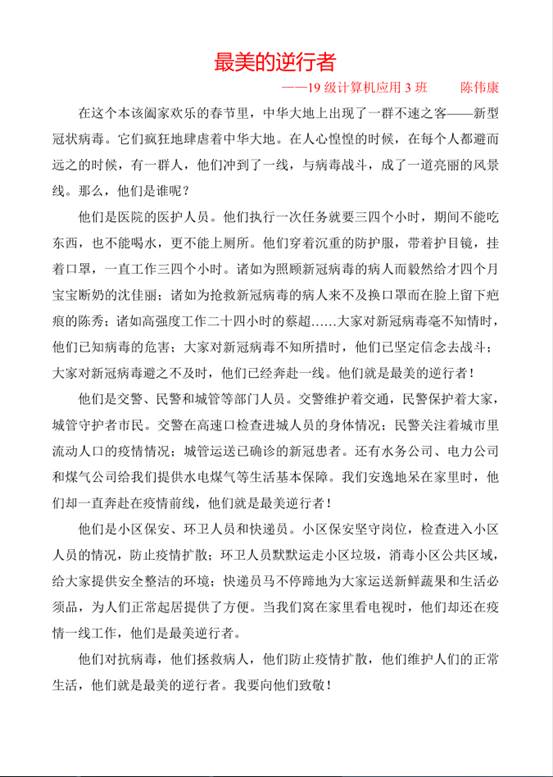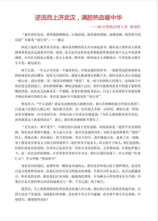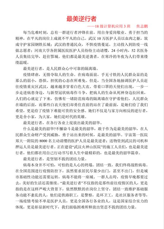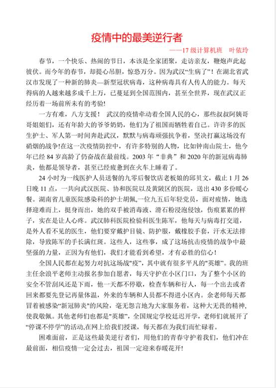 为致敬抗“疫”斗争以来这些勇敢的逆行者,也为了让学生更加充分的了解他们感人的事迹,表达对他们深深的敬意,2月26日,电子信息系根据学工处下发的《关于在疫情防控期间开展向“最美逆行者”我身边或心中无私奉献的人学习活动的通知》,认真开展了致敬最美逆行者征文主题活动。在疫情发生期间电子经管系的各位班主任积极的利用网络向同学们宣传与疫情的相关的新闻和防疫知识,同时利用各种机会有针对性地对学生开展思想政治教育,积极引导学生深化思想认识,激发爱国热情,筑牢理想信念,树立必胜信心。在本次征文活动开展的时候,同学们纷纷行动起来,一句句饱含深情的话语,一封封情真意切的致敬信,无不在传递着美好的心愿,承载着真诚的感谢!