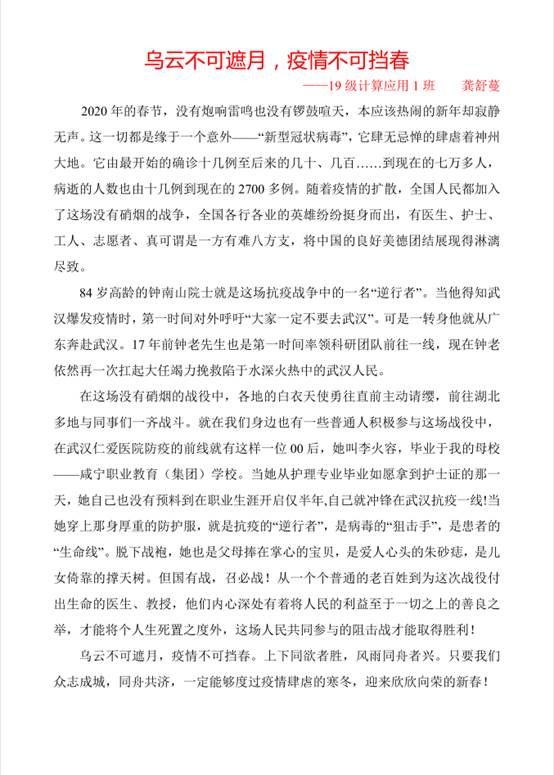 此次征文共有21个班级参加征文活动,经过班级初选,有51篇文章报送系部,以经过系部筛选,有5篇文上报学校。通过此次主题活动,学生们对前方的医务工作者和他们的工作有了更多的了解,也对这场没有硝烟的战疫有了更深刻的认识。“长风破浪会有时,直挂云帆济沧海。”只要全国人民齐心协力,共同战“疫”,我们坚信,没有一个冬天不可逾越,没有一个春天不会到来!