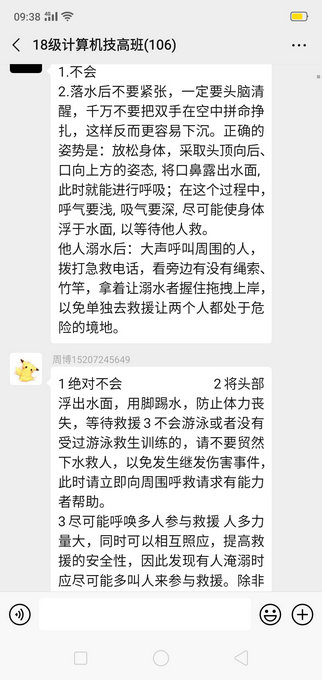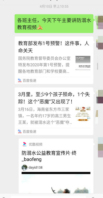 结合疫情防控形势,各班主任通过班级QQ群和微信群开展溺水安全视频教育。有的视频向学生介绍游泳安全知识,教学生掌握一些简单的自救办法;有的视频教育、引导学生以正确的认识和科学、安全的方法参与夏季有关活动,树立防溺水意识,杜绝学生无家长陪护到河中游泳;各班及时将此次溺水教育告知家长,让家长在家监督学生的安全。