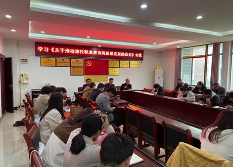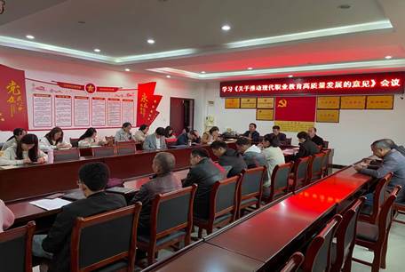 会议由周辉同志主持,强调此次学习的重要性,每一位教师要引起高度重视。周辉同志具体从“总体要求”、“强化职业教育类型特色”、“完善产教融合办学体制”、“创新校企全作办学机制”、“深化教育教学改革”、“打造中国特色职业教育品牌”,“组织实施”七个方面领学《关于推动现代职业教育高质量发展的意见》内容。