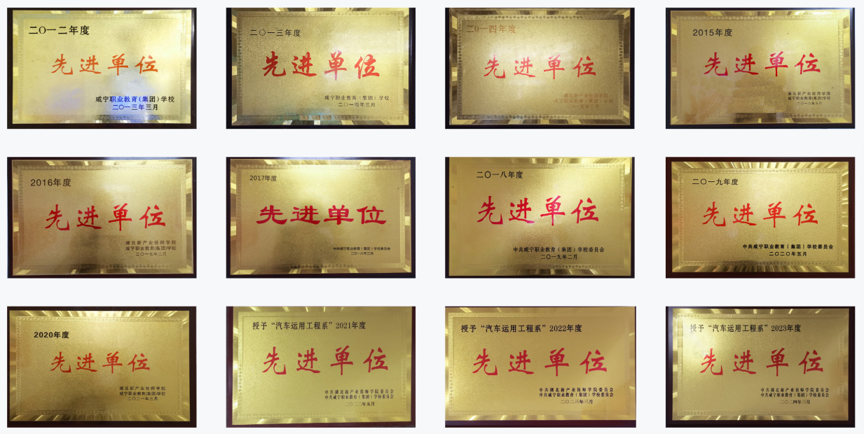 汽车运用工程系拥有一支专兼结合、“双师” 结构优化的教学团队。现有专业教师17名,具有高级职称教师3名; "双师”素质教师13人;聘任汽车类专业"楚天技能名师”2名和行业企业技术专家2名。近年来,该系师生参加省、市级中职学校技能大赛多次获得汽车维修赛项二、三等奖、“咸宁工匠”、“咸宁市技术能手”、2024年荣获湖北省中华职业教育创新创业大赛一等奖。2017年被市直机关工委授予“红旗党支部”荣誉称号, 自2012年至今,该系连续13年被集团学校评为“先进单位”。