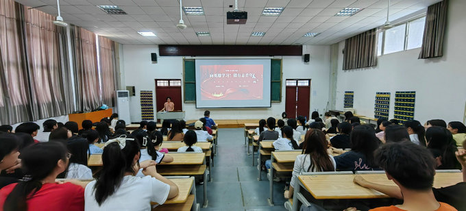程星书记的授课题为《向英雄学习 做有志青年》,她向大家分享了7个故事,分别是中共一大的故事、毛泽东家族牺牲的英雄先烈的故事、周恩来严于律己的故事、半条被子的故事、抗日英雄杨靖宇和赵一曼的故事、将军农民甘祖昌和他的妻子龚全珍的故事。她从中共一大建党凝结的红船精神,到伟人家规体现的思想品质,再到革命先烈为国捐躯的壮烈之举,无不在告诉广大青年学子,应珍惜好时光,不负过来人。在她的讲授下,一个个英雄人物跃然纸上,一段段英雄事例感人肺腑,同学们纷纷凝神谛听,认真思考,积极互动,现场学习氛围十分浓厚,尤其是听到毛岸英牺牲时毛泽东说的一段话以及赵一曼就义前写给幼子的一封信时,很多同学都红了眼眶。课程的最后,程星书记呼吁全体新生审视自我、严于律己,学习共产党人的优秀精神品质,养成勤俭节约、艰苦奋斗的良好品格,心怀报国之志,为中华民族的崛起而不懈努力。