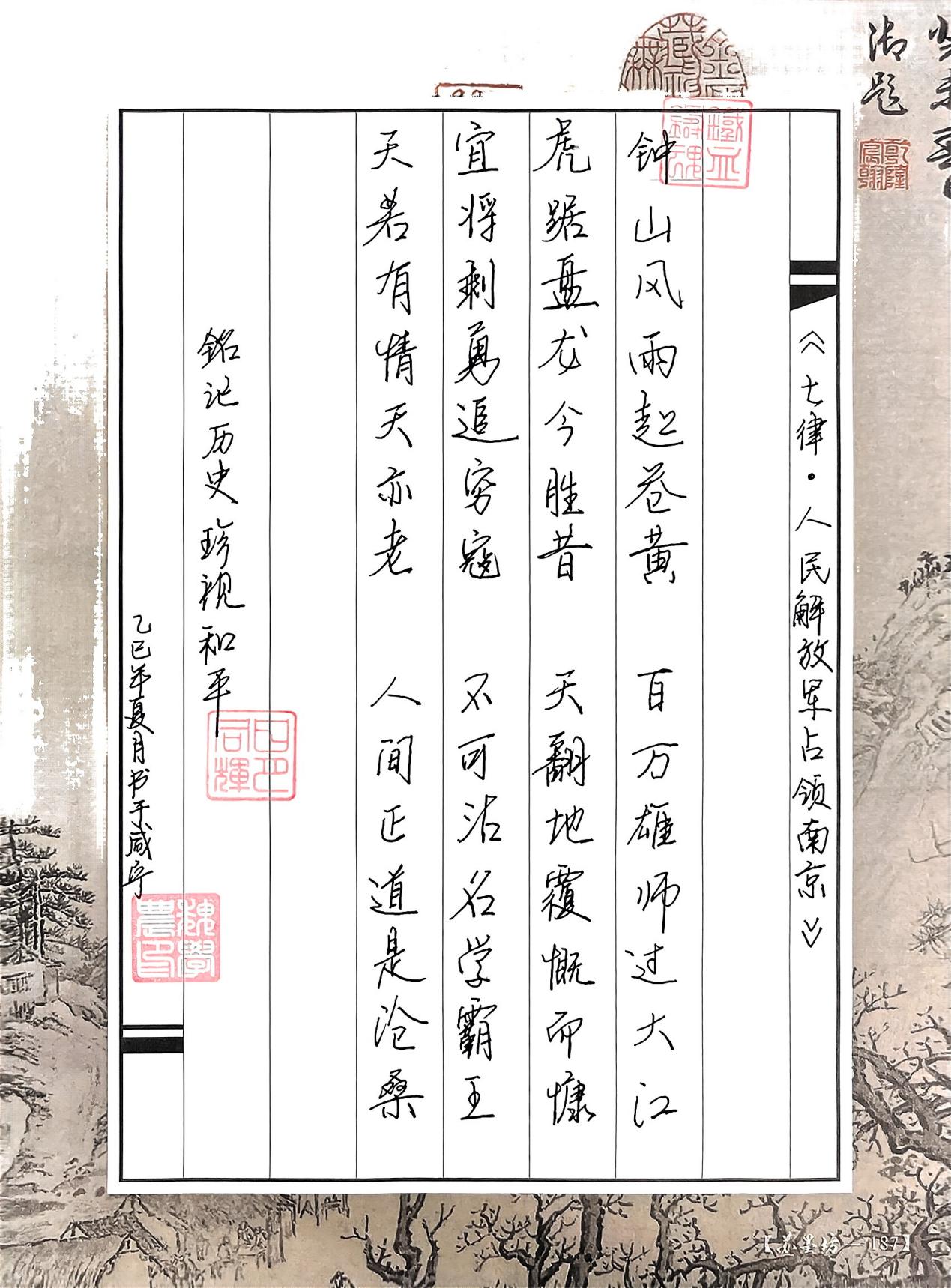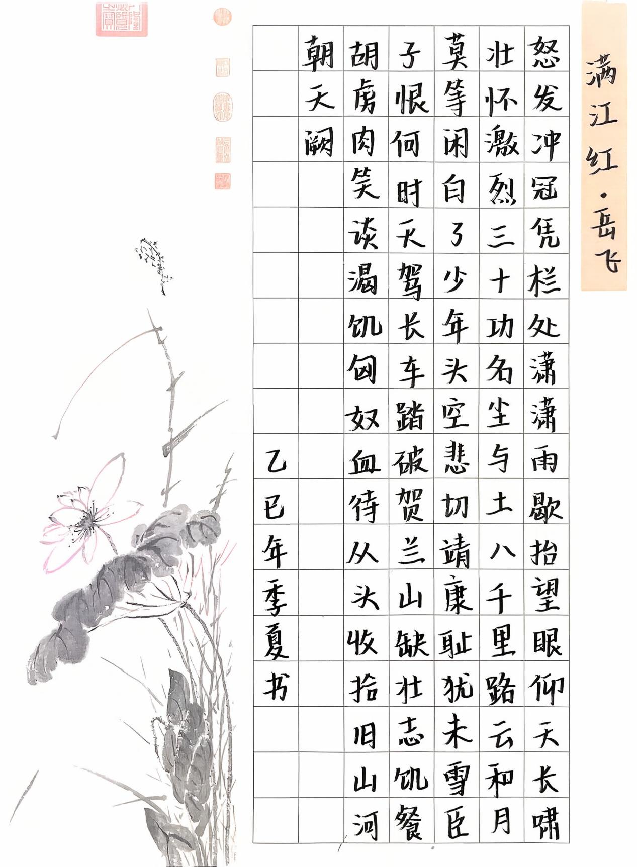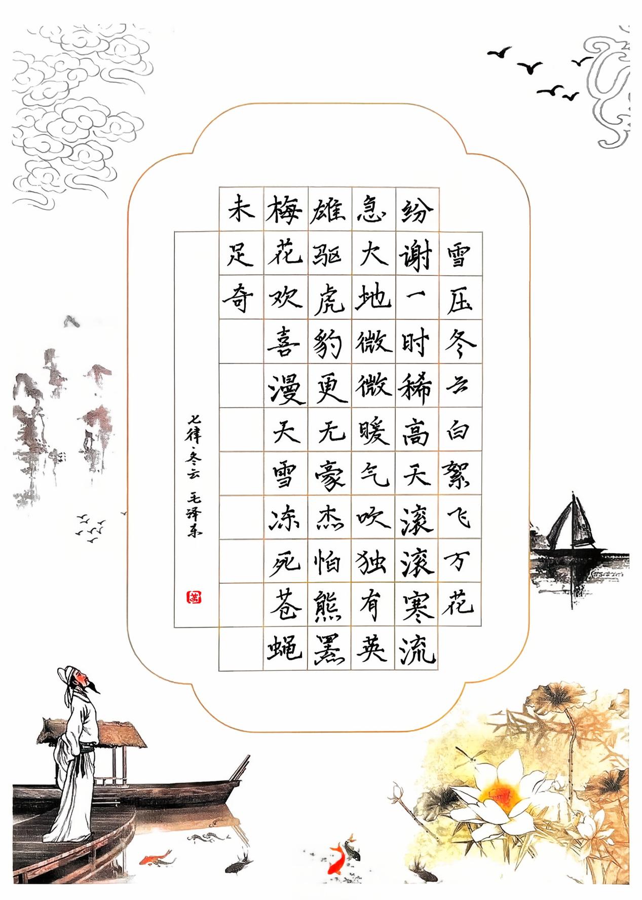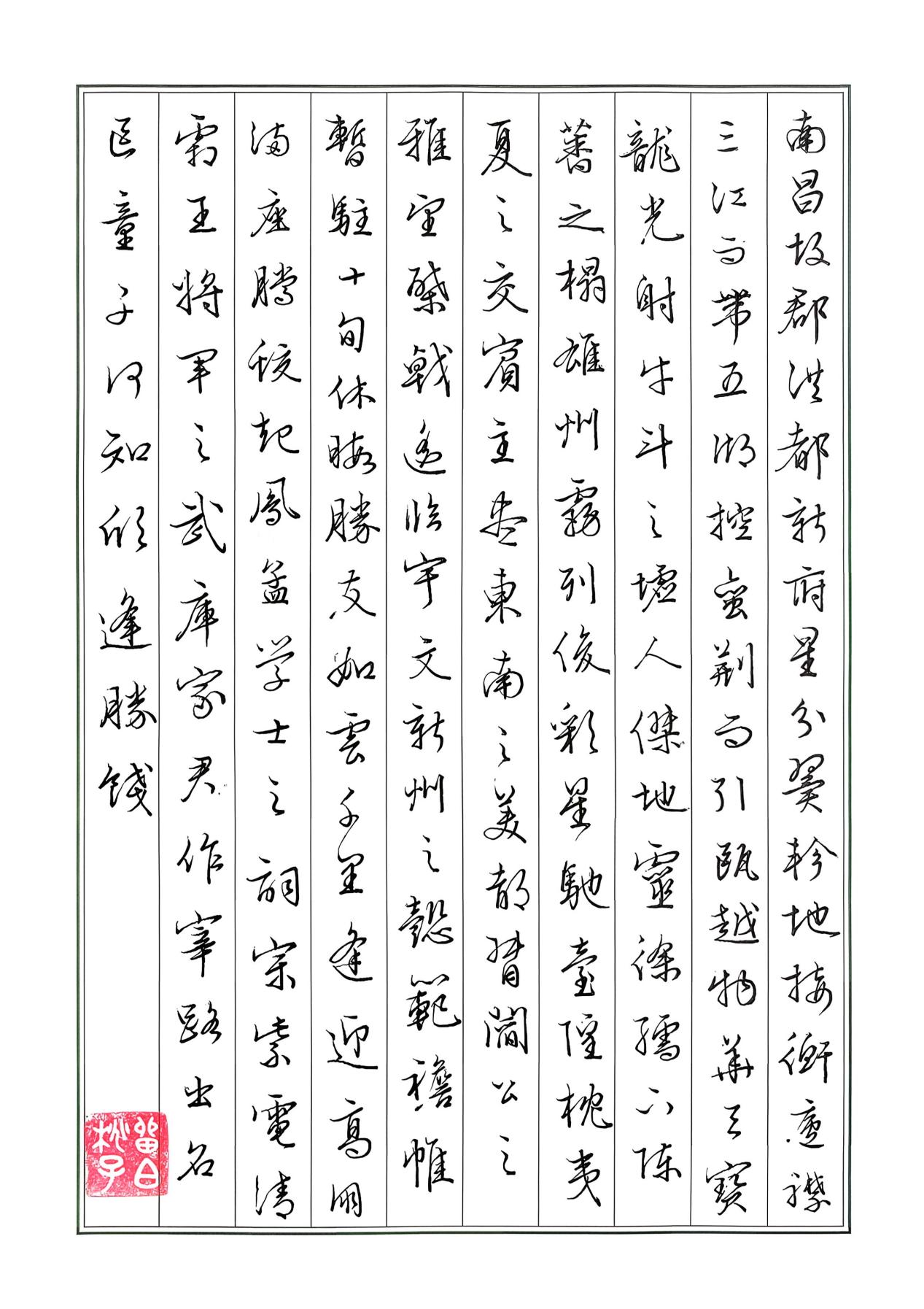 很不错,笔画有粗细变化,结构得当,可以看得出你临过古代的碑帖,是从王羲之一路书风走下来的,更像元朝赵孟頫一路的书风。笔画和结构都非常得当,但最后印章大了,全篇章法要注意字之间的大小关系,疏密关系。