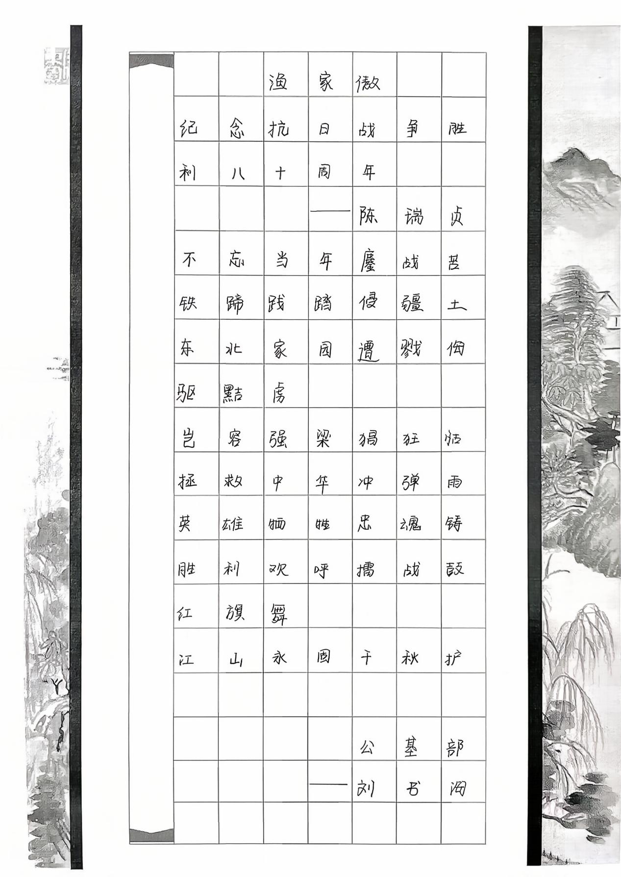 书法作品中,楷书的端庄大气、行书的流畅洒脱等多样书体交相辉映,既展现了教师扎实的艺术修养,更让红色精神通过笔墨得以具象化传递,不仅能感受书法艺术之美,更能透过文字重温抗战岁月,在潜移默化中接受精神洗礼。