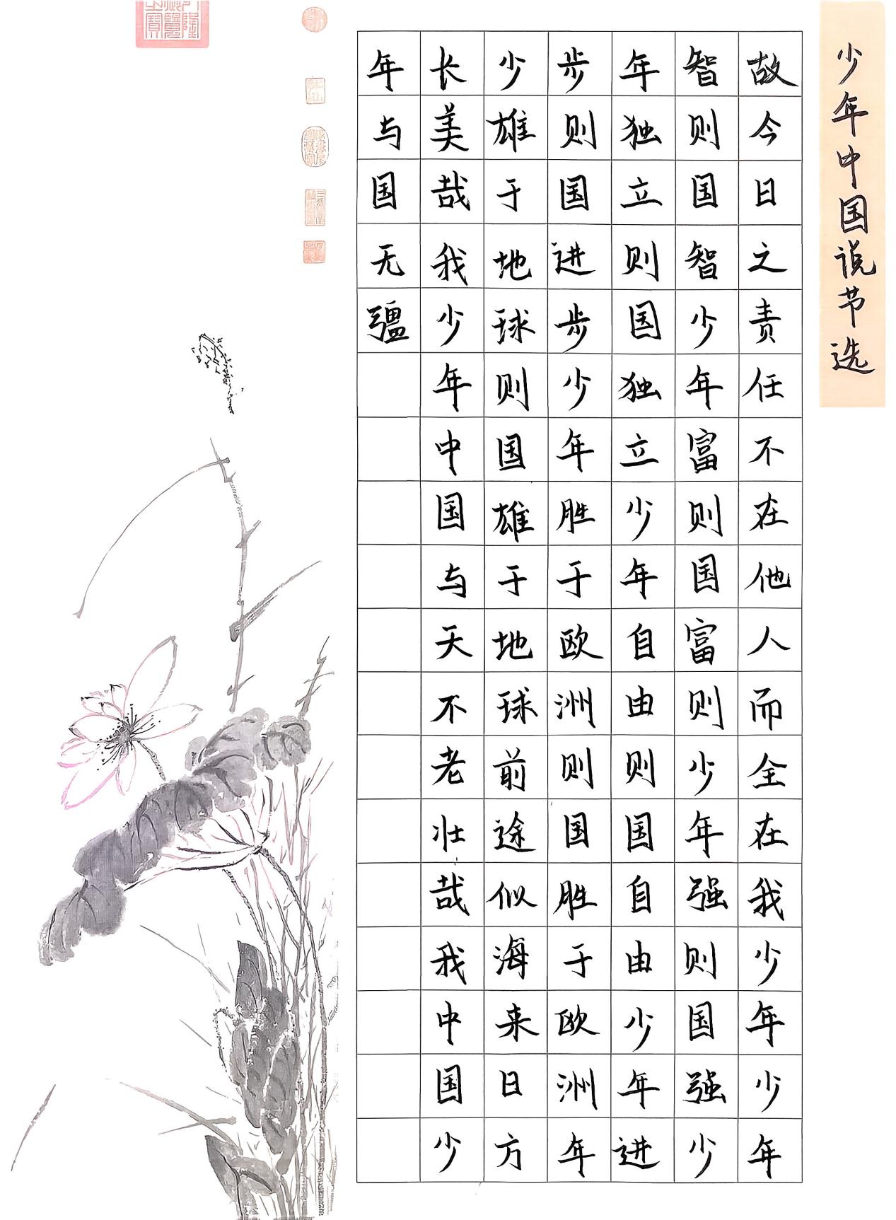 楷书笔画清劲有力,线条动感较强,起收分明,结字开放又不失中敛,有唐朝诸遂良的劲朗风格,很专业,很不错,但最后落款印章稍大。新书起笔收笔交代清楚,但有两幅行书写得不是很专业,估计没有用心思去写,结构稍微平板没有势,建议多临王羲之圣教序。