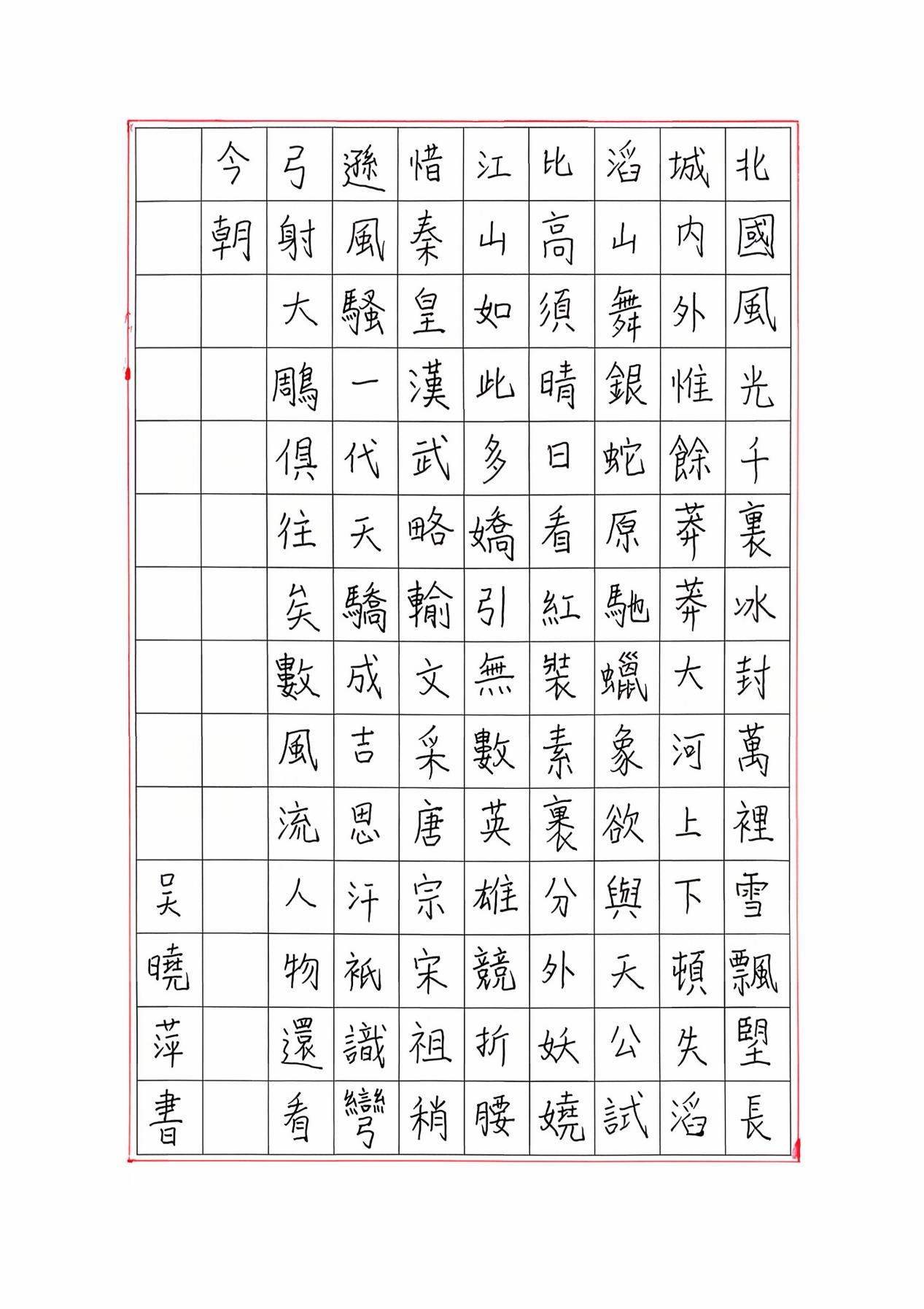 全篇章法与结构都还不错,用笔比较踏实,比较稳重,是在努力写好这篇作品,注意行笔还要交代清楚,例如竖的起笔,要尖锋入笔,空中下笔,停顿后再向下行,把八个笔画多练习你的楷书一定会写的更好。