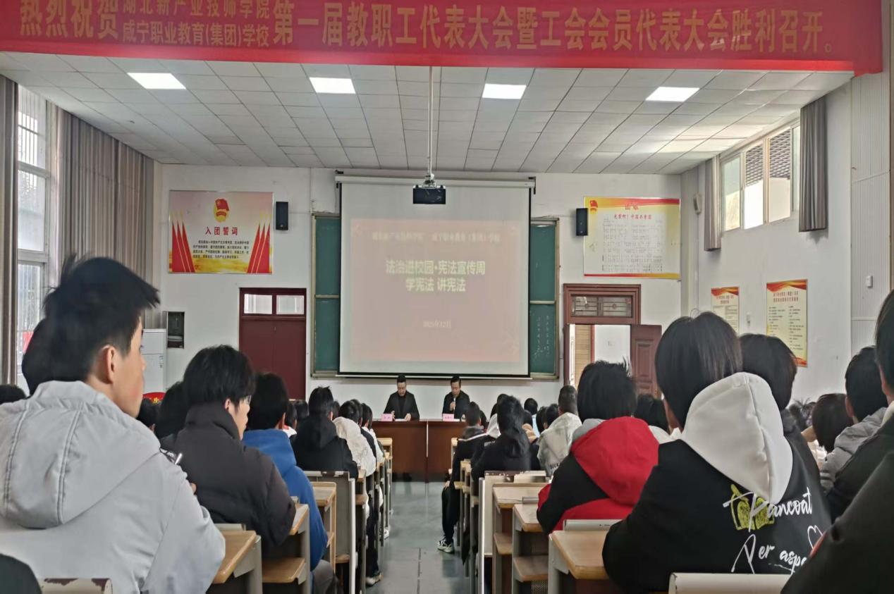 为深入学习贯彻习近平法治思想,推动宪法深入人心,提升师生的法治意识与素养,12月15日,学校开展了“学宪法 讲宪法·弘扬宪法精神 践行法治思想----为青春成长筑牢法治根基”专题讲座。本次讲座由学校法治副校长、湖北海舟律师事务所王新律师主讲。学校师生代表200余人聆听讲座。